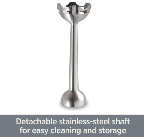 Moreover, the immersion blender’s design is tailored for convenience. The extra-long 9-1/4-inch drive shaft is a standout feature that significantly enhances its usability. This extended shaft makes it easy to reach into deep bowls and pots, providing you with the flexibility to blend larger quantities without hassle.